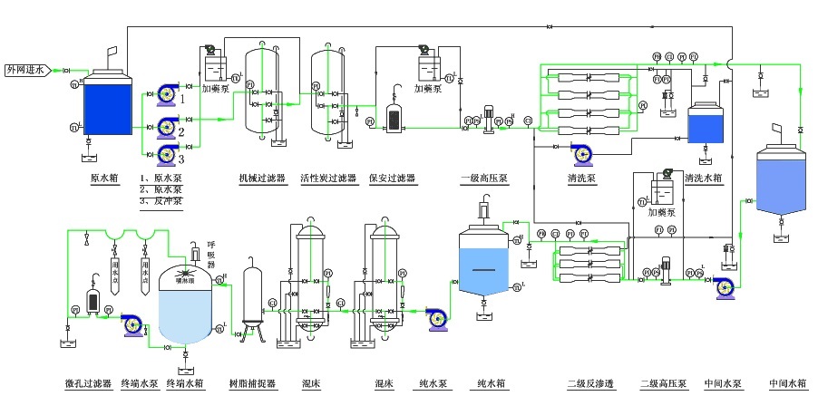原水 → 原水箱 → 原水泵 →多介质过滤器 (石英砂过滤器)→活性炭过滤器 →软水处理器(添加阻垢剂装置) → 精密过滤器 → 高压泵 → 一级反渗透(RO)装置 →紫外线杀菌装置(臭氧杀菌装置) → 用水点
